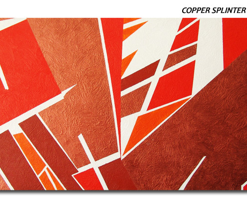 My EDGE series is particularly time consuming to create. I lay the paint in with a strong texture, so maintaining the sharp edges is like drawing a straight line on a corrugated metal fence. This piece is COPPER SPLINTER in 38″ x 72″ and is one of the largest single-canvas paintings I have created. Take a look at my gallery for more EDGE paintings.